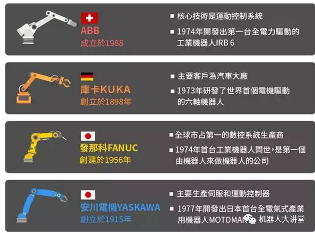 它们在亚洲市场同样也是举足轻重,更占据中国机器人产业70%以上的市场份额,几乎垄断了机器人制造、焊接等高阶领域。下面我们来揭开这四大家族的神秘面纱吧。